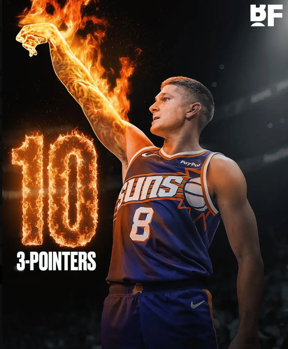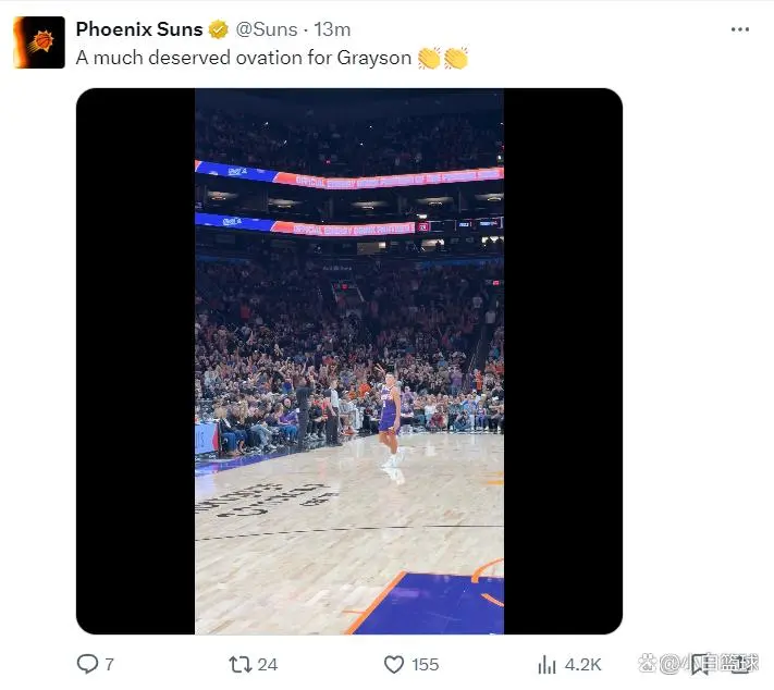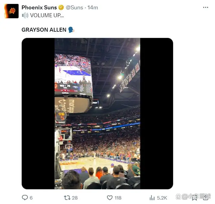太阳官方这场比赛成为阿伦第一粉头寻牛堂,我数了一下关于阿伦的推文30分钟内有7条,因为阿伦在不断逼近队史单场9个三分纪录与阿伦生涯最高分(40分)。