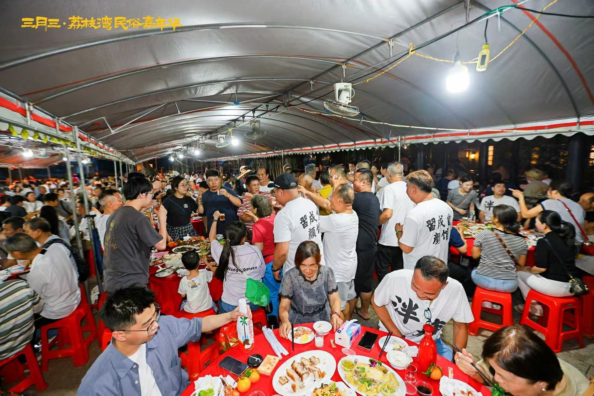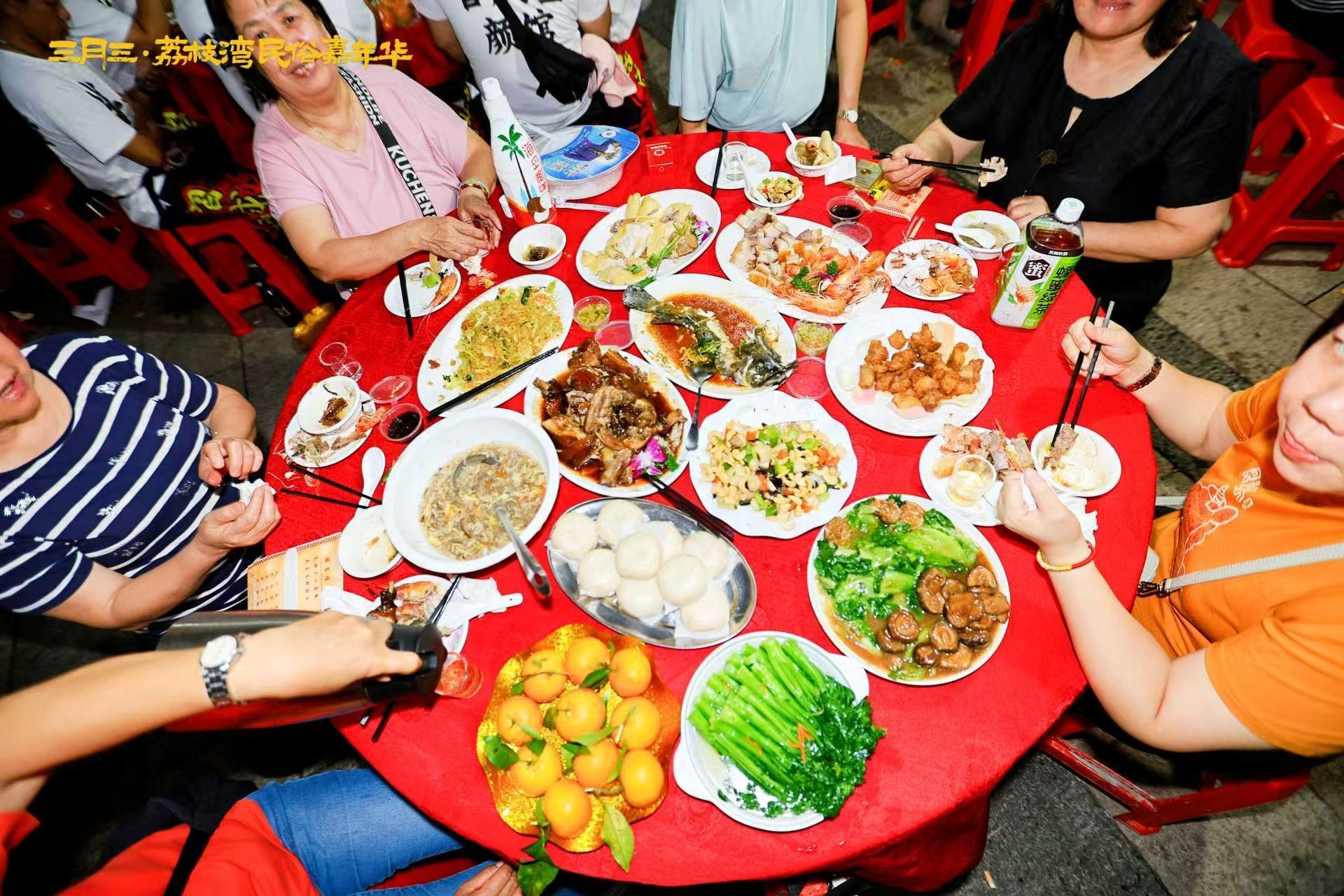 三月三当天傍晚,船桨广场、五秀广场、梁家祠旁广场、大戏台前广场同时摆开圆桌,百余桌宴席沿水岸铺开,村民与游客并肩而坐。菜单写在红纸上:招财聚宝瑶柱羹、金凤报喜白切鸡、五福呈祥豉油鹅、年年有余珍珠斑、鸿运当头大红虾、锦绣前程炒丁粒、红皮赤壮烧金猪、节节高升富贵骨、生财添福扒花菇、福寿双全庆齐眉、碧绿常青靓菜心……