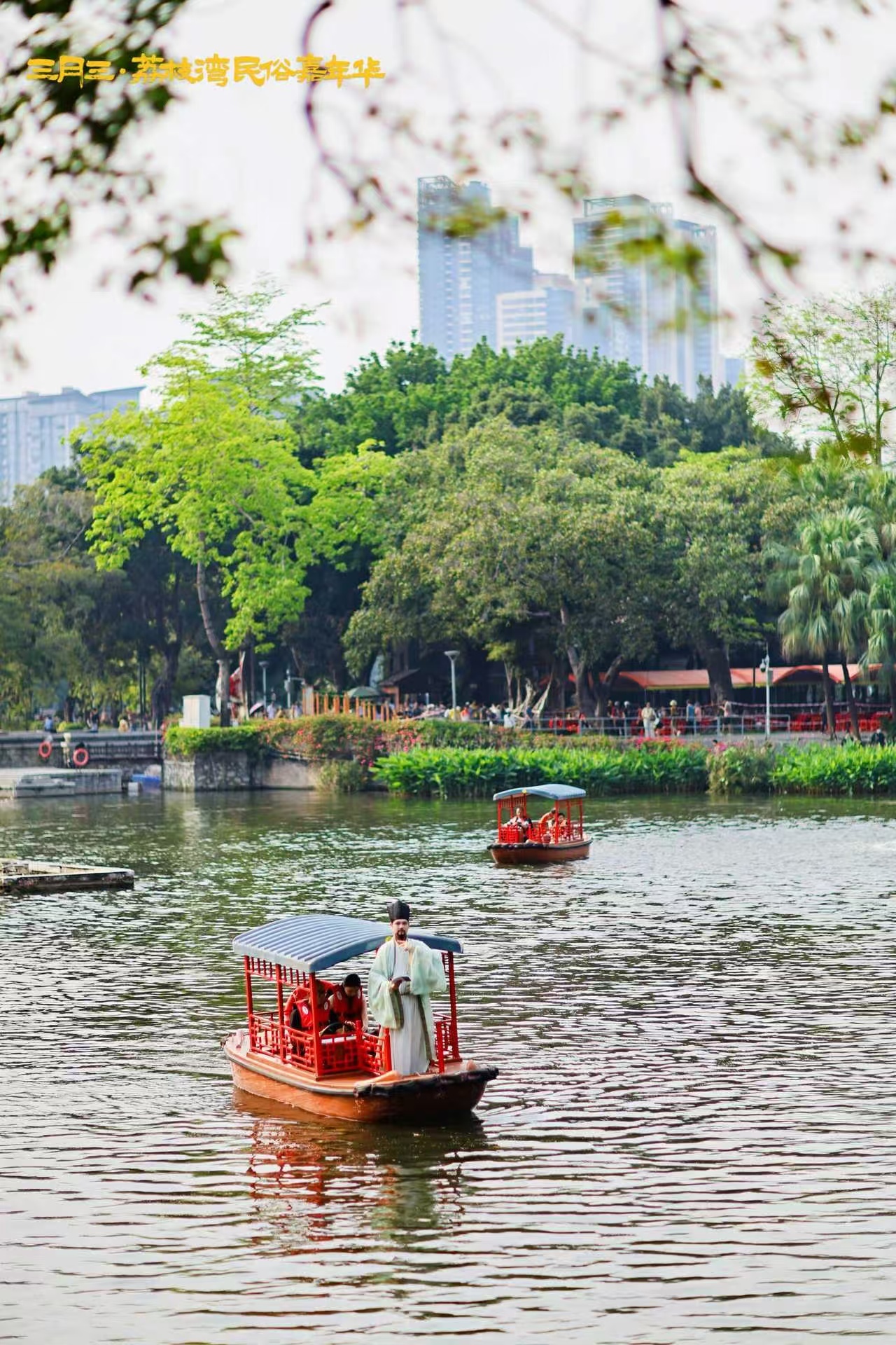 环湖步道上,“苏东坡”邀游客对诗,答对可获“解压符”;“芍药仙子”手提花篮,向游客赠送一枝春花,取意《诗经》“赠之以芍药”;化身为“状元郎”的清代泮塘进士黄其表,则为备考学子送上“顺利上岸”的祝福。