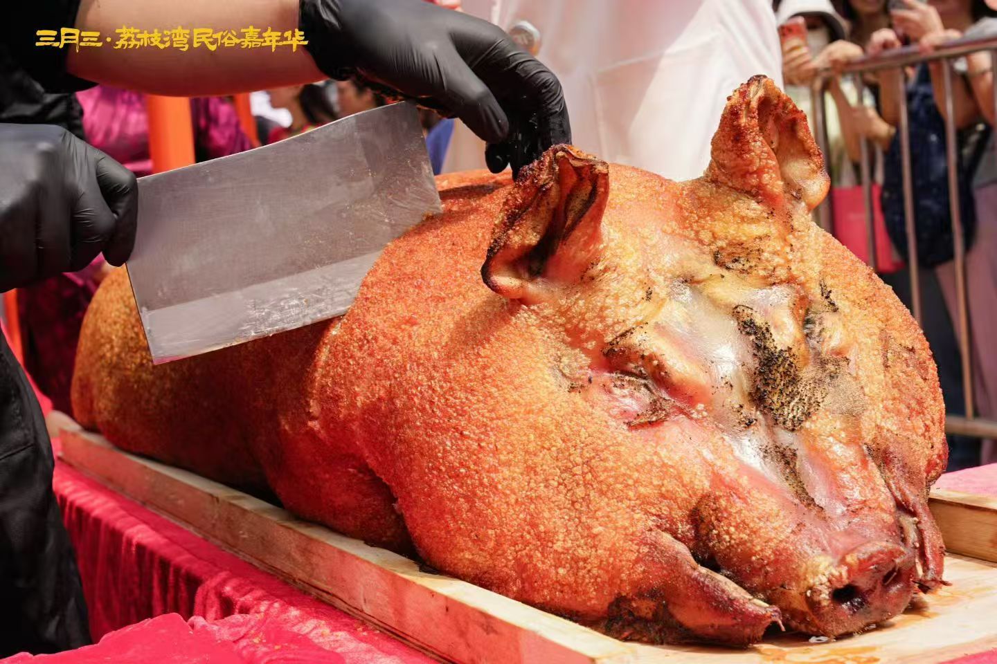 最后,村中长老们一起为醒狮点睛、切烧猪,祈愿风调雨顺、福泽绵长。一位参与仪式的老村民说:“三月三在我们村一直是大日子,今年能在水岸边把老规矩展示给大家,心里很高兴。”